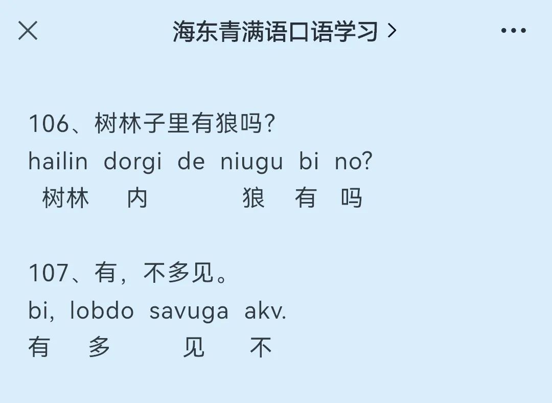 狼生活在树林里,有例可证。如上图满语教材中,对话内容为:树林子里有狼吗?有,不多见。东北森林中有狼出没,故有此对话。所以,我推测,博浪沙行刺现场当为河岸台地的树林中。2200多年前黄河下游地形地貌和今天变化不大,但生态当优于今日。彼时,河岸台地上有树林,林中有狼出没,张良豢养的刺客躲在树林中,始皇的车队靠近,action!