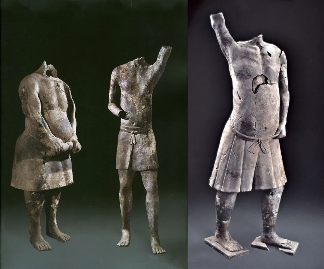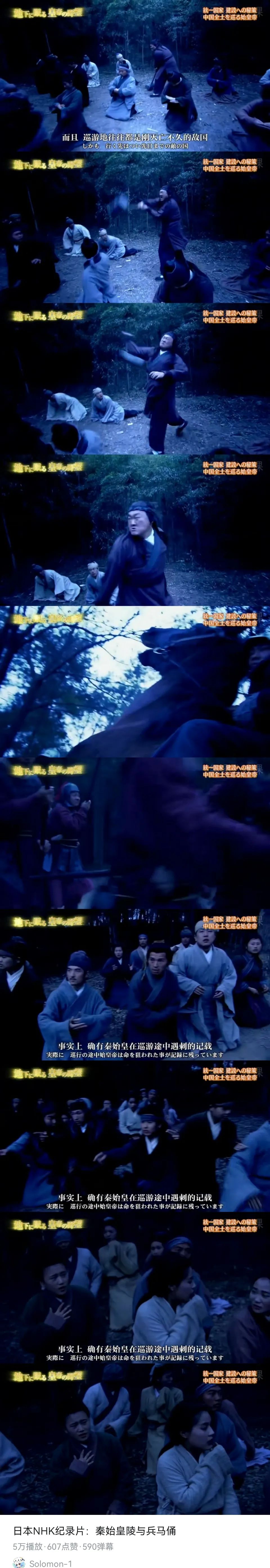 这上面部纪录片还原场景里,博浪沙的刺客躲在路旁的树丛中。 这是1962年日本拍的《秦始皇帝》中博浪沙行刺未遂事件片段。电影制作时秦陵地下军团尚未发现,服装道具自是去真实远矣。这部电影还原场景中,刺客是在路边的高崖上居高临下扔铁椎,这也不对。拿如今的原阳县古博浪沙遗址来说,其位置在黄河北,地面坦荡无垠,找不出像样的高地。