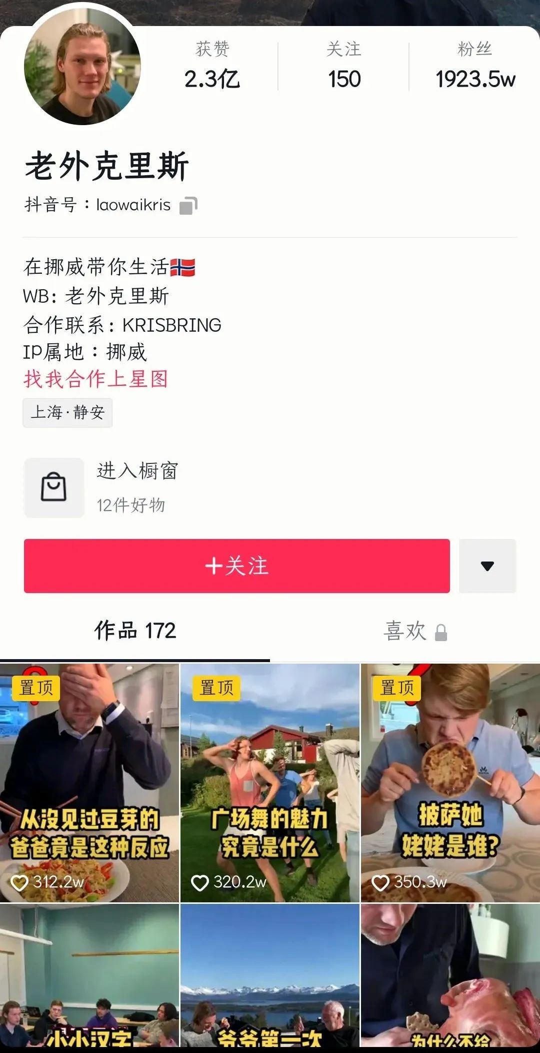 比如说一位挪威小哥,就在抖音等短视频平台上发布自己全家人的“中国式生活”,以全家人吃中国餐为主,收获粉丝超1900万,比整个挪威的人口还要多。