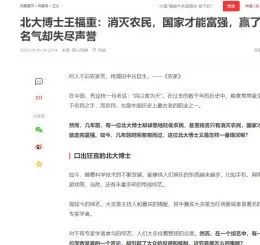 然而,正讲在兴头上的王福重无暇顾及现场观众的反应,他继续着他的高谈阔论。在最后总结的时候,他说了这样一句话:“只有彻底消灭农民,中国才能实现富强。”此话一出,众人哗然。