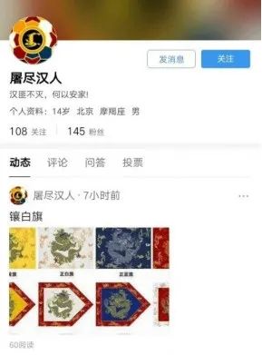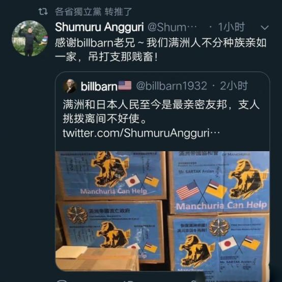 (他们怀念“大清”和伪满,还搞了国旗,上面的三个人物分别是:努尔哈赤、皇太极、溥仪)