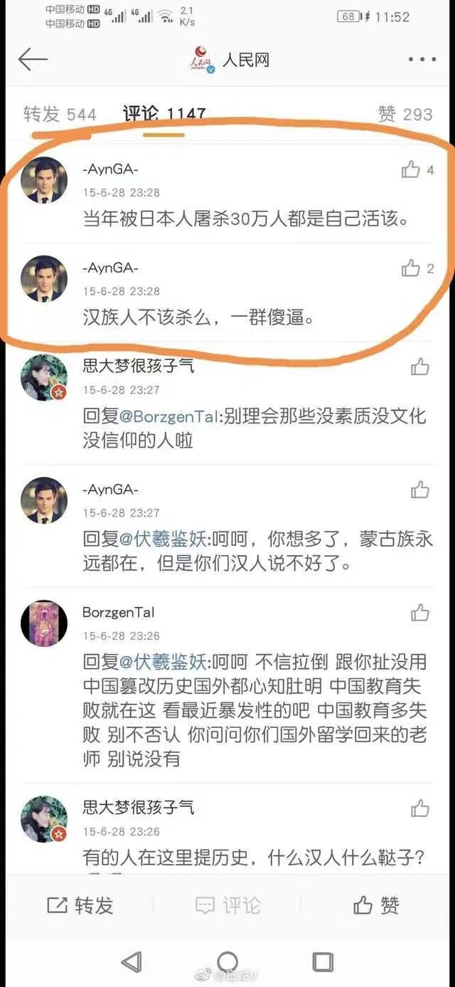 他还标榜自己的蒙古族身份,说什么“蒙古族永远都在,但是你们汉人就不好(说)了。”