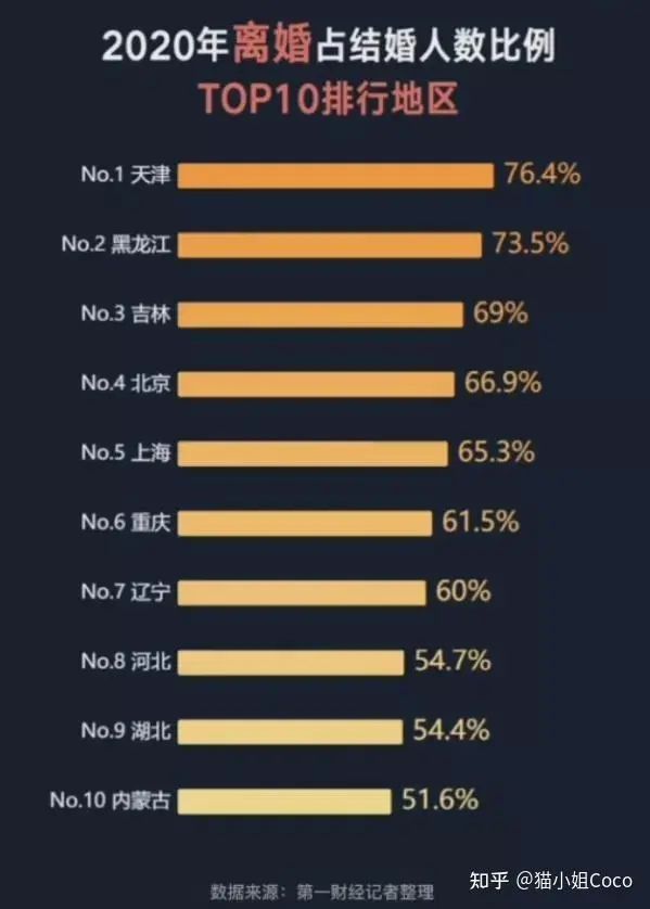 从目前的数据来看,离结比高达60%,也即是说100对结婚的同时,有60对离婚,而在天津,这个比例高达76.45%!